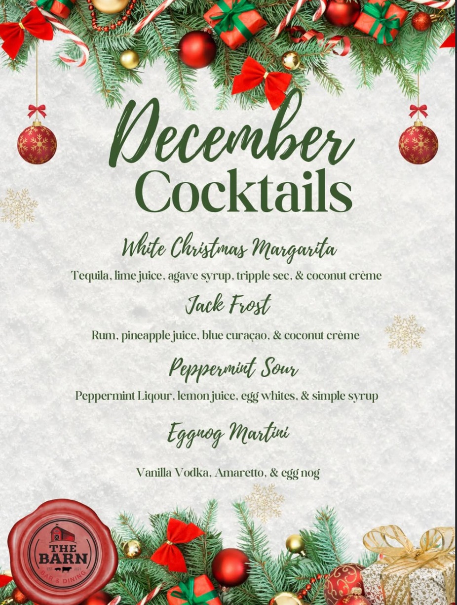 Christmas Cocktails are here! Sip your way into the season with our December lineup — from cozy classics to holiday-inspired twists that sparkle just like the lights. White Christmas Margarita Jack Frost Peppermint Sour Eggnog Martini Your new favorite holiday drink is waiting at The Barn. Come taste the magic!
