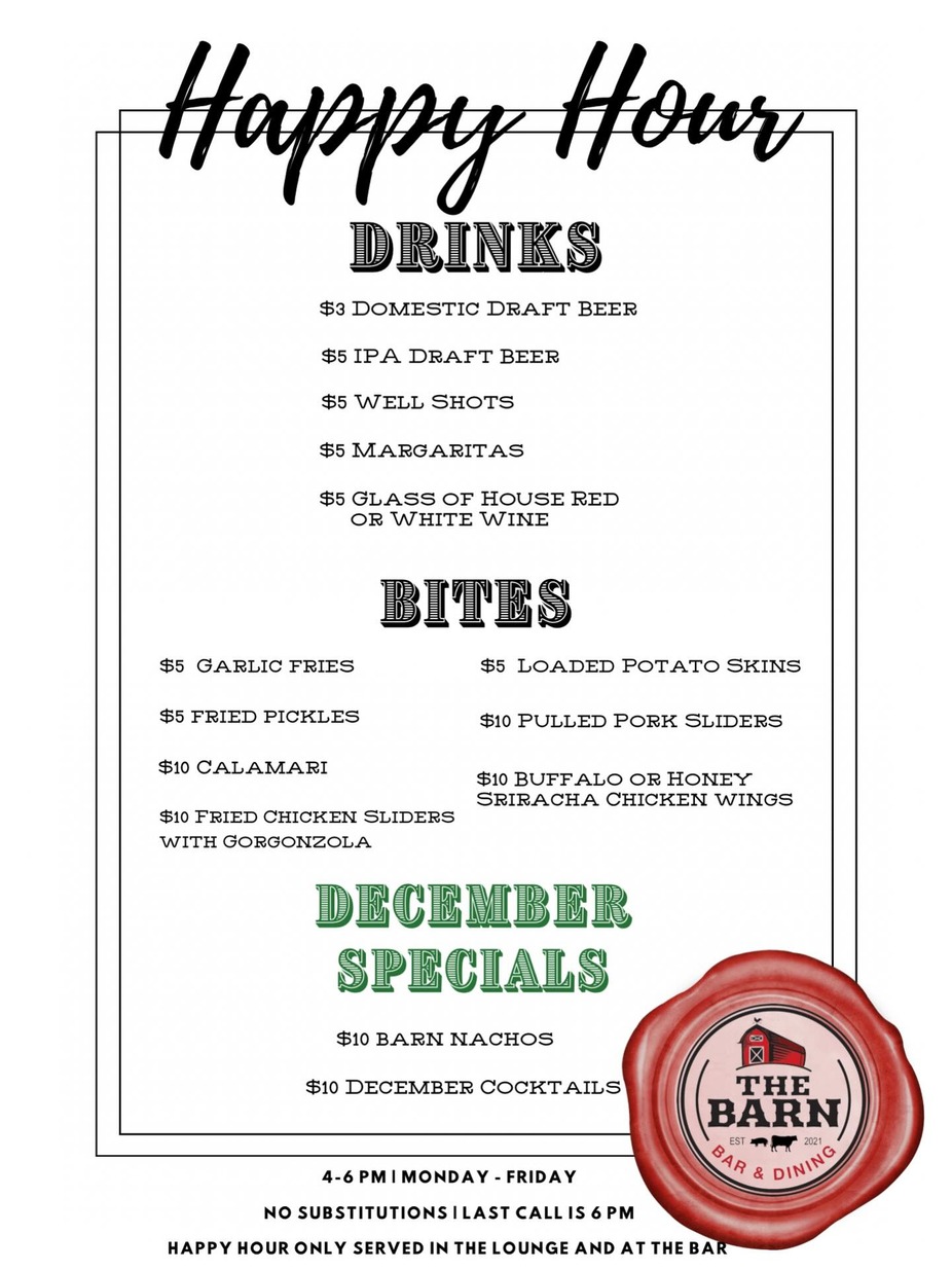 Come unwind with us — your new favorite Happy Hour is right here at The Barn!